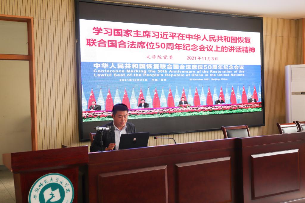 学习会上,刘飞带领大家集中学习了国家主席习近平在中华人民共和国恢复联合国合法席位50周年纪念会议上的讲话精神,他指出,习近平总书记在中华人民共和国恢复联合国合法席位50周年纪念会议上的重要讲话,为推动全球共同发展指引方向。全体教职工要深刻领会我国恢复在联合国合法席位的重大意义,进一步坚定“四个自信”,始终坚持和加强党的全面领导,坚定不移走中国特色社会主义道路,努力为实现中华民族伟大复兴而不懈奋斗。要深刻领会党和国家事业取得的历史性成就,始终在思想上政治上行动上同以习近平同志为核心的党中央保持高度一致,更加坚定自觉做到“两个维护”。
