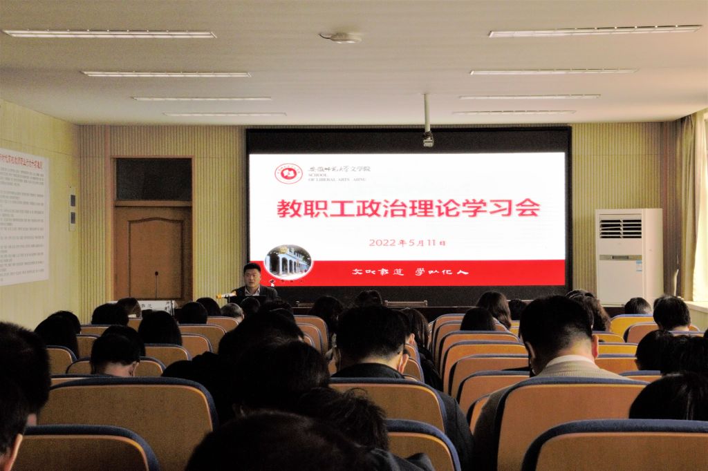 院党委副书记刘飞首先带领大家学习了习近平总书记在中国人民大学考察时的讲话精神。他从习近平总书记在考察时强调的坚持党的领导传承红色基因扎根中国大地,走出一条建设中国特色世界一流大学新路的思想出发,强调我们要坚持党的领导,坚持马克思主义指导地位,坚持为党和人民事业服务,落实立德树人根本任务,传承红色基因,扎根中国大地办大学,走出一条建设中国特色、世界一流大学的新路。
