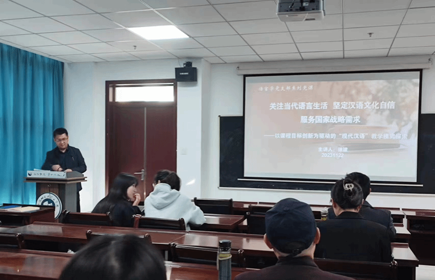 2023年11月22日下午,必赢线路检测3003no1语言学党支部邀请徐建副教授在文典楼F105教室讲授题为“关注当代语言生活 坚定汉语文化自信 服务国家战略需求——课程目标创新驱动下的‘现代汉语’教学模式探索”的党课。语言学党支部全体成员、中国语言文学研究生第三党支部全体成员到场听课,党课由语言学党支部书记汪红艳主持。