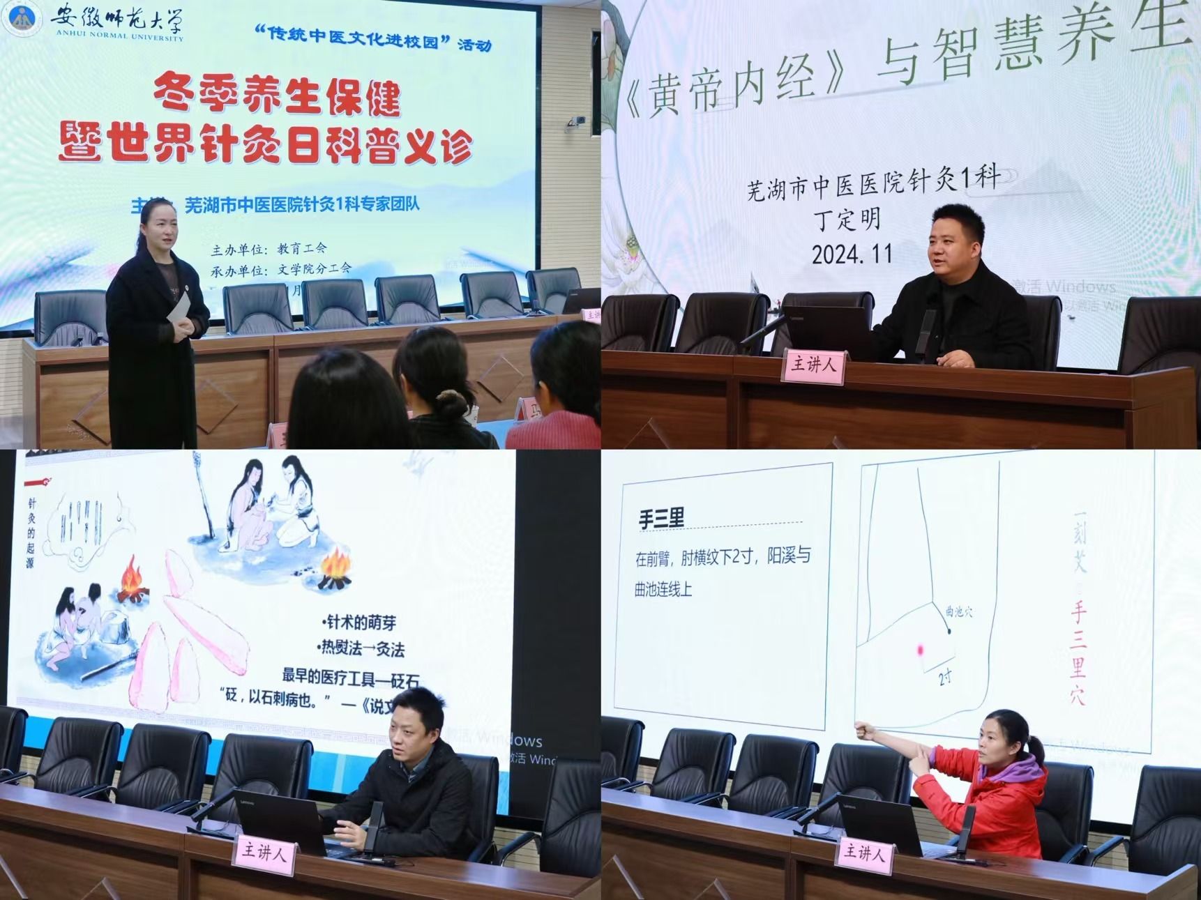 活动现场,芜湖市中医医院针灸1科专家团队丁定明、张正龙、马岚三位老师受邀为师生们带来了精彩的冬季保健及针灸知识讲座。生动详细的讲述,让广大师生感受到中医文化的博大精深,养生不仅是身体的保养,更是心灵的修行;也让大家对针灸这一古老而又充满生命力的疗法有了更加全面的认识,还现场学习了日常生活中可以自己尝试着来改善身体状况的简单的针灸推拿方法。讲座结束后,芜湖市中医医院针灸1科专家团队还为师生们提供了义诊服务。义诊现场,医护人员们认真询问每位师生的身体状况,仔细检查,耐心解答他们的疑问,并为有需要的师生提供了针灸等中医理疗服务。现场气氛热烈而温馨,许多师生纷纷表示通过此次活动不仅学到了许多实用的中医养生知识,还亲身体验到了针灸的神奇疗效,对中医文化有了更深的认识和了解,希望今后多举办类似的公益活动。
