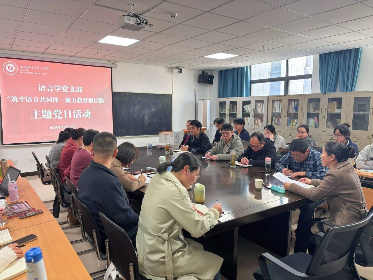 会议伊始,语言学党支部副书记徐莉老师领学了《教育强国建设规划纲要(2024-2035年)》第六条“推广普及国家通用语言文字”部分内容,以及教育部、国家语委《关于加强高等学校服务国家通用语言文字高质量推广普及的若干意见》。在工作交流环节,汪红艳系统介绍了学院服务国家语言文字战略的实践路径,连续四年完成教育部“语培计划”和“童语同音”计划,对民族地区和农村地区教师开展国家通用语言文字能力提升培训,开展特色活动,按质按量完成培训任务;推广基地还组织学生和教师参加了多种类型的语言文字竞赛展演活动,取得优异成绩;语言学团队依托中国语言资源保护工程,完成多项方言调查任务并出版系列成果,储泰松领衔的《中国语言资源集·安徽》《徽音皖韵:安徽童谣集萃》和方言普查专项研究获得学界认可,徐建在语言资源保护项目中发挥关键作用,指导的作品获“挑战杯”全国大学生课外学术科技作品竞赛一等奖,“徽声皖韵”暑期社会实践团队连续四年开展方言田野调查,既传承了地域文化,又培养了青年学子的动手能力,形成教学科研与实践育人深度融合的特色人才培养模式。