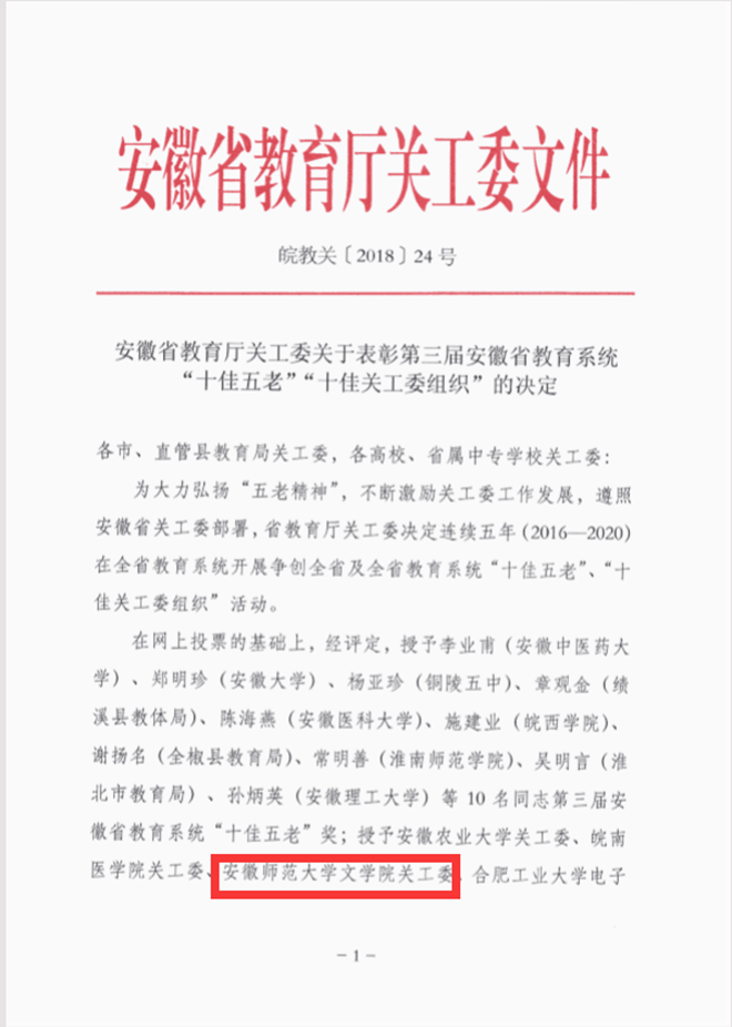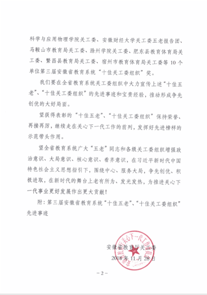 日前,安徽省教育厅关工委发布《关于表彰第三届安徽省教育系统“十佳五老”“十佳关工委组织”的决定》,必赢线路检测3003no1关工委获评第三届安徽省教育系统“十佳关工委组织”。