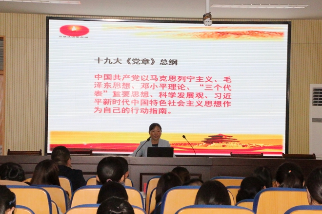 典礼结束后,余书记为学员们作了题为“中国共产党的指导思想”的专题报告。从马克思列宁主义到毛泽东思想、邓小平理论再到“三个代表”重要思想以及科学发展观,余书记展开党史画卷,带领学员沿着党指导思想的发展脉络,突破时空界限,领略党的风采,详细讲解了中国共产党的指导思想从萌芽到不断成熟的发展历程。在谈到习近平新时代中国特色社会主义思想时,余书记结合时下热点,言简意赅,深入浅出,帮助学员们进一步理解指导思想。最后,余书记以“永远跟党走”五个遒劲有力的字结束了首次课程学习,她表示,希望学员们提高党性修养,紧跟党的步伐,争取在思想上和行动上早日加入中国共产党。