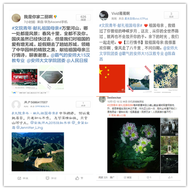 创意相伴,与时俱进。除了在线下开展爱国主义教育,国庆期间,培训班还别出心裁地在微博上发起了“文院青年·献礼祖国母亲”的话题,学员们通过在微博上晒出自己创作的三行情书、剪纸、书画、照片等作品向祖国母亲表达自己的满腔深情与热血 。“中华娉婷。何以爱你眉目,只道初心不负。怎可情深如故,只言山河寸土。”一位学员在微博上这样向祖国母亲表白道,三行情诗,一字一句情真意切,一颗红心熠熠生辉。有的学员晒出了自己亲手制作的剪纸作品,小小的方寸红纸在其巧裁妙剪之下脱胎换骨,灯笼、国旗、天安门,各式喜庆的国庆元素混合在一起,成为为祖国母亲庆生的最好礼物。还有的学员晒出了自己的书法和摄影作品,配以简短精致的文字说明,同样饱含了对祖国母亲深沉的爱恋与祝福。通过这样的线上活动,学员们积极参与其中,扩大了活动的传播范围与影响力度,也表现出文院学子积极进取、情思细腻的精神风貌。
