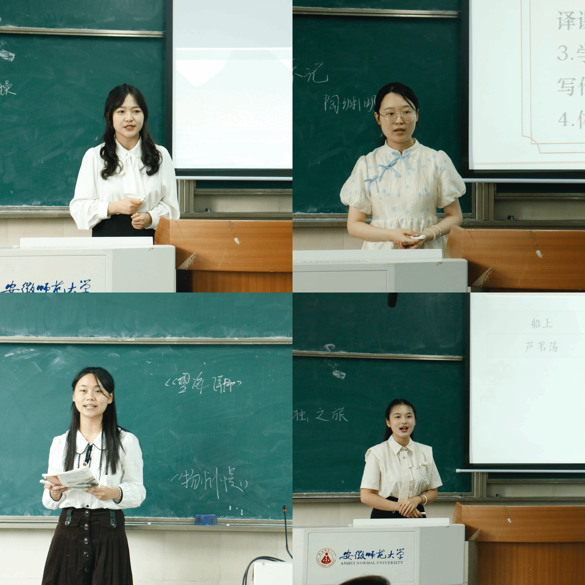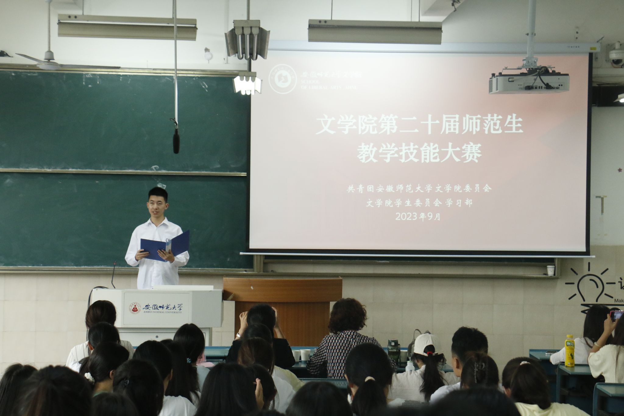 经过选拔,共有23位学生从各班级脱颖而出参加此次比赛。本次比赛分为教学设计、即兴演讲、教学展示(模拟授课、课件制作、板书设计)、教学反思四个环节,对参赛选手的教学技能进行综合性考核。各位参赛选手结合新课标要求做了充分准备,选取中学课文《阿房宫赋》《故都的秋》《荷塘月色》等内容,规范使用国家通用语言文字,借助PPT和板书教学辅助方式,模拟师生互动和小组讨论,思路清晰,板书工整,教学内容详实,教学设计合理,讲解生动流畅。在精彩的课堂教学展示中,各位同学展现了我校师范生良好的综合素养,达到了以赛促练、以赛促训、以赛促学的比赛目的。来到现场观摩的2022级师范生们也给予良好反馈。