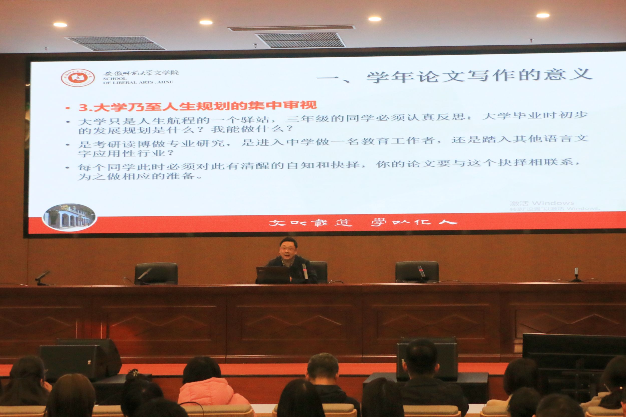 专业主任胡承佼作了动员报告。他向同学们深入阐释了学年论文写作的重要意义,强调其作为综合性学业考核方式的关键作用;鼓励学生深入挖掘选题内涵,提出可在学年论文基础上进一步拓展深化,为毕业论文奠定良好基础。此外,胡承佼还细致解读了学年论文与学位论文的差异,并梳理了学年论文与双创项目、培优计划之间的内在联系,为同学们提供了清晰的学术指引。