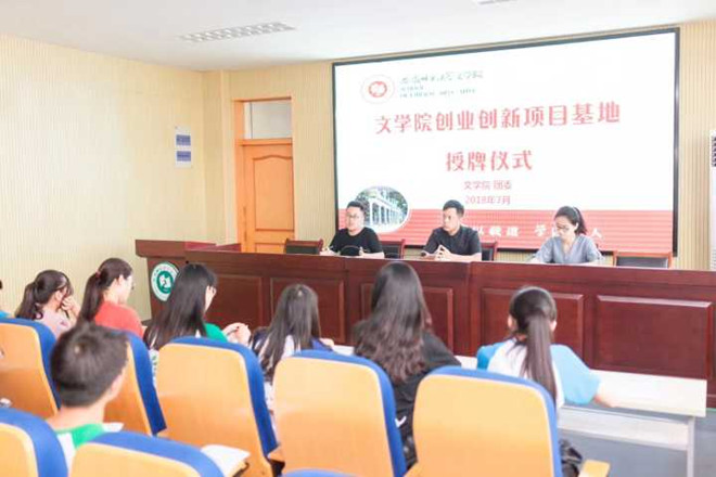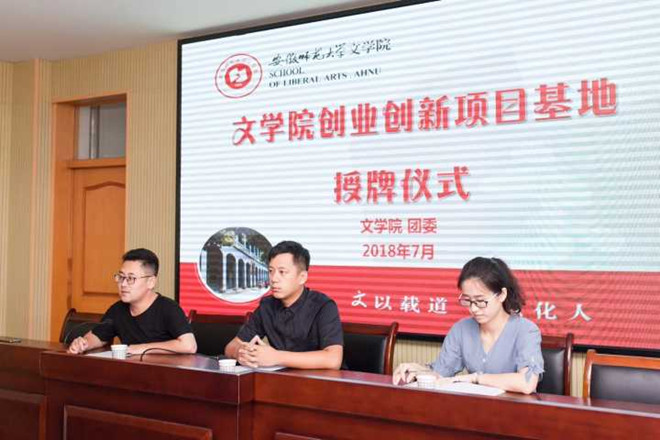 为拓宽创新创业平台,创新育人模式,提升人才核心竞争力,7月15日晚,必赢线路检测3003no1与芜湖市叶茂广告公司在行政楼三楼报告厅举行创业创新项目基地授牌仪式。芜湖市叶茂广告公司董事长江时文、必赢线路检测3003no1辅导员杨穆龙、徐雅萍,各年级学生代表参加仪式。