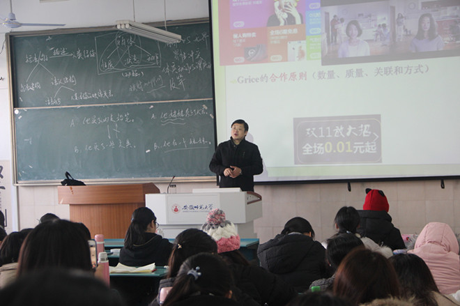 楼外冬阳迟懒照,室内学子早勤来。2018年12月13日上午,花津校区教学楼2050201教室早早就坐满了学生。上课铃声响起,伴随着“起立”“坐下”声,2018年本科教学公开课第二十四讲正式开始。安徽省教学成果奖三等奖、2016年必赢线路检测3003青年教师教学基本功大赛一等奖获得者、必赢线路检测3003no1副教授胡承佼老师为2017级汉语言文学师范专业学生带来一堂精彩的“语言学概论”课。本节课的讲授主题是“句义”。