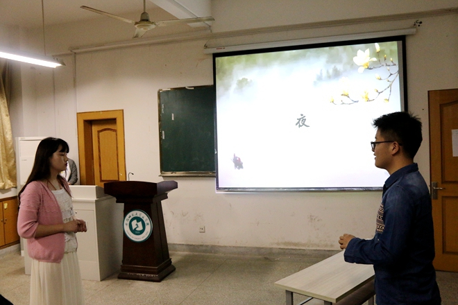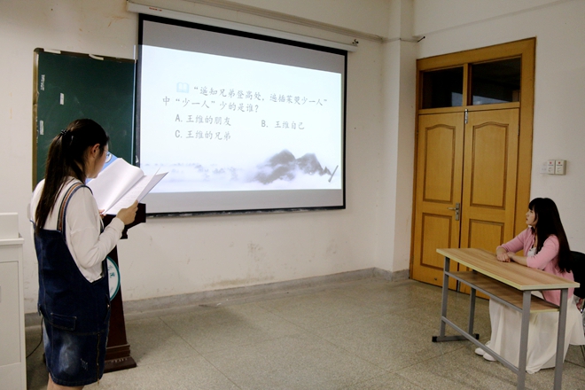 “斗力频催鼓,争都更上筹”。整场比赛紧锣密鼓,气氛紧张,选手们你追我赶,精彩纷呈。评委老师不时对题目中涉及的诗词和典故做出细致有趣的讲解。叶帮义从“惟将终夜长开眼,报答平生未展眉”的诗句中勾勒出诗人元稹为报答亡妻生前恩义而终身不娶的深情形象;“感时花溅泪,恨别鸟惊心”,邹春秀以这句诗为切入点,引导选手们深切体会“诗圣”杜甫睹物伤情的忧思与感伤;王轶老师则借助“千金纵买相如赋,脉脉此情谁诉”和“君不见咫尺长门闭阿娇,人生失意无南北”两句诗引出了“金屋藏娇”的典故,并简要分析了诗词对生活和政治的美化作用。此后,三位评委老师还就诗人陶渊明在当时不受关注,到后世却“粉丝”众多的原因发表了各自的看法,引起了在场同学们的深沉思考。第二轮的飞花令环节更是高潮迭起,围绕“夜”、“花”、“月”、“风”四个字的诗词对答,对战双方互不相让,伯仲难分,短暂的思考停顿之后又是一番引经据典、妙语连珠,给现场观众们带来一场精彩的诗词盛宴。