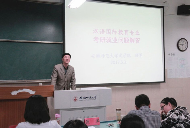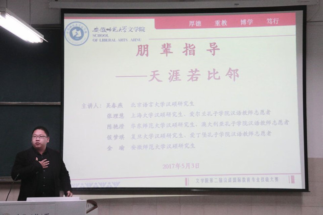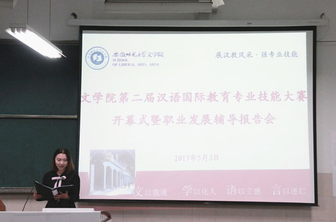 春色齐放溢师大,专业技能绘人生。为进一步满足汉语国际教育专业学子不断探索职业技能的需求,引导学生确立正确的职业选择方向,夯实专业基础,由2015级汉语国际教育专业主办的“必赢线路检测3003no1第二届汉语国际教育专业技能大赛开幕式暨职业发展辅导报告会”于5月3日晚在2050203教室拉开帷幕。汉语国际教育专业指导教师潘晓军、顾军,汉教专业辅导员汪旭、李维岩及汉语国际教育专业硕士金瑜受邀出席此次报告会,14、15、16级汉语国际教育专业的本科生到场聆听。