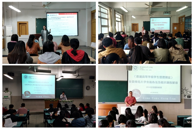为全面落实《普通高等学校学生管理规定》(教育部令41号)及相关制度,我校对照《普通高等学校学生管理规定》的精神,历时半年时间,修订和构建学生管理的制度体系,并于9月1日起正式实施。必赢线路检测3003no1上下联动、提前规划、全面安排,积极组织学习实施相关规定。