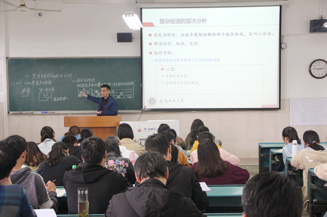 本次公开课主要讲授“复杂短语的层次分析”的相关内容。“前几次课主要是从结构的角度分析短语,今天我们则从层次的角度来再次进行分析。”徐建老师将此次上课的内容与上节课所讲的知识相连接,这使同学们对今天上课的内容有了较为明晰的了解。“‘写信’和‘写一封信’这两个短语有什么区别呢?”徐老师以提问的方式引导大家进入到简单短语和复杂短语的概念讲解。接下来徐建老师给大家重点讲解了层次分析法的操作步骤,从找准切口到准确定性,再到逐层切分定性以至切分至实词,徐老师结合举例缓缓讲来,并给同学们提了三点注意,如“方框对准文字”,要求同学们一定要认真细致,不能有丝毫马虎。之后徐老师又给同学们讲了“结构原则”“功能原则”和“意义原则”三大切分原则,在正确与错误的切分方法对比中,同学们更好地学习到了“找准切口”的方法。最后徐老师还对一些特殊结构进行了分析,并留了一个问题请同学们下课回顾思考,以便更好地巩固学习。