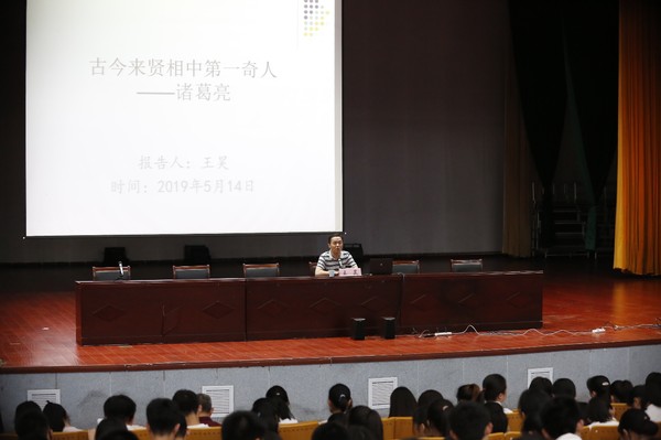 2019年5月14日下午,芜湖一中开展了“《三国演义》整本书阅读教学观摩研讨暨学术报告会”的活动。王昊教授应邀为该校高一年级1400余名师生作了一场题为《古今来贤相中第一奇人——诸葛亮》的学术报告。报告由芜湖一中教务处许纪友主任主持,庞定亚校长、查海曼副校长、语文教研组长程丽华老师出席报告会。