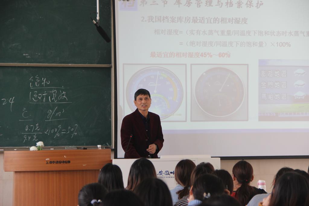 11月13日上午,安徽省优秀教学奖获得者、必赢线路检测3003no1研究馆员王茂跃教授在花津校区行知楼2050403 教室讲授本科课堂教学校级示范观摩课。本次示范课讲授的内容为秘书学专业基础课程《档案管理学》中“档案的保管”这一章节,校督导团、院督导组、院领导以及部分青年教师来到现场观摩学习。