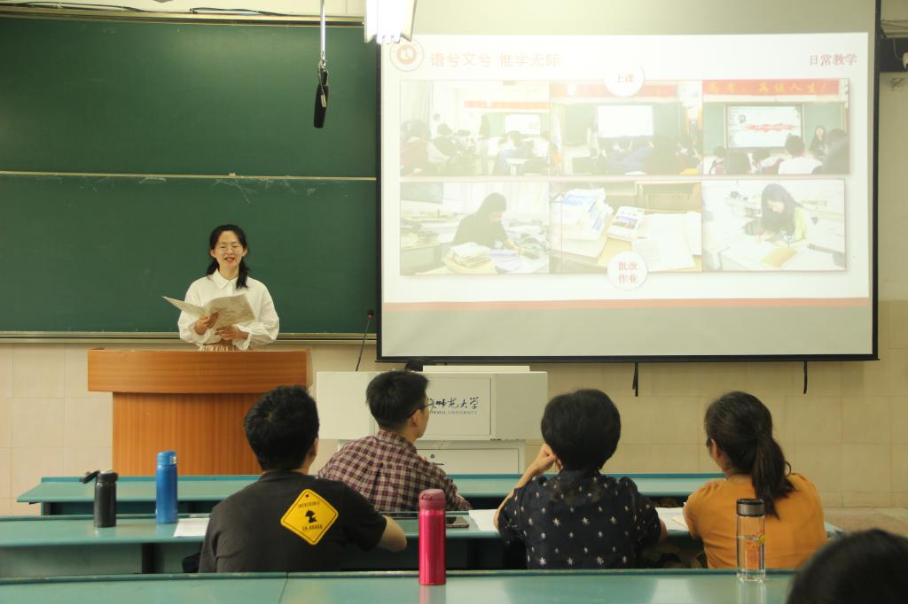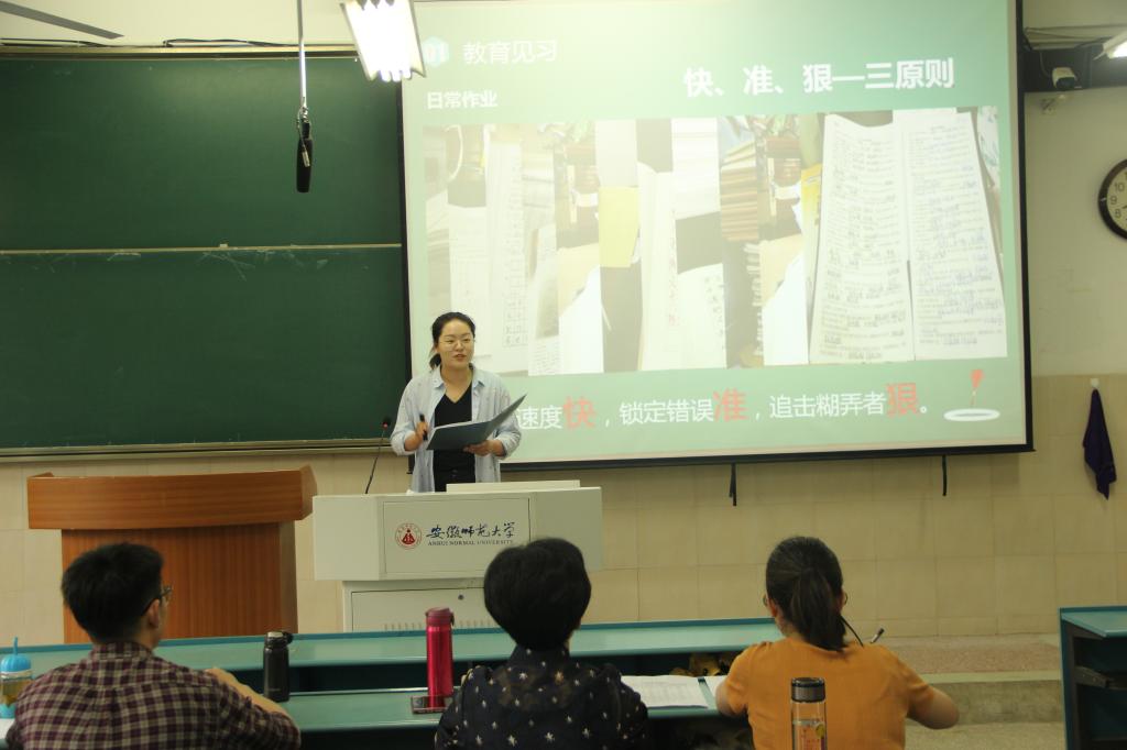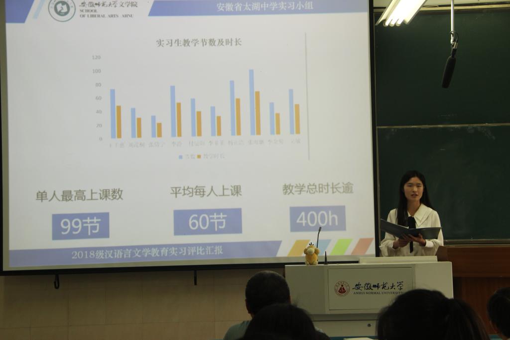 开学伊始,汉语言文学专业2018级师范生便进入了教育实习的校内准备阶段,3月下旬入驻各实习基地校,6月20日完成了为期12周的实习任务后返校,随即进入教育研习环节。17个实习小组在组内成员充分交流的基础上,从中推举出一位优秀实习个人到年级交流。2050103教室里,17位优秀个人代表按照抽签顺序,依次上台,汇报交流各自的教育实习经历和心得体会。经过三个月的学习和锻炼,同学们在知识积累和实践能力方面均有了长足的进步。各实习小组优秀个人代表采用PPT汇报的形式从筹划准备、实战演练、成果固化等方面展现了他们教育实习的历程。吴敏同学潜心躬行“落实文本、以生为本”的教学理念,从语文教学工作和班主任实习工作两个方面谈经验,话成长;伊霜霜同学通过图表的形式将实习过程中所见、所学、所感直观地展现给评委和观众们,学校先进的教学理念和管理方式,老师们严格的教学风格、深厚的理论知识、丰厚的教学经验和对学生无微不至的关怀,都给她树立了榜样的力量,指引她在成为一名优秀语文教师的路上继续前行。杨心如同学对待实习工作怀有一颗敬畏之心,将理念付诸于实践,从备课、教学实践、教学理念、课堂氛围的营造四个方面生动呈现了实习的收获与感悟。三个小时生动精彩的汇报,全场多次响起热烈的掌声。必赢线路检测3003no1陆昌萍、夏艳、石润宏、曹鹏鹏、张治超5位老师现场指导和评分,在场学生观众在听完整场汇报交流后,按照优秀指标点,对他们心目中的优秀实习个人进行了现场投票。