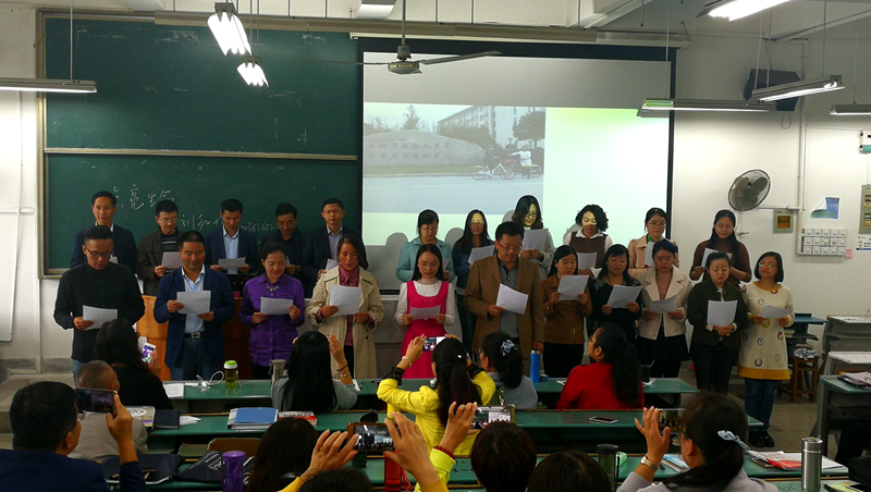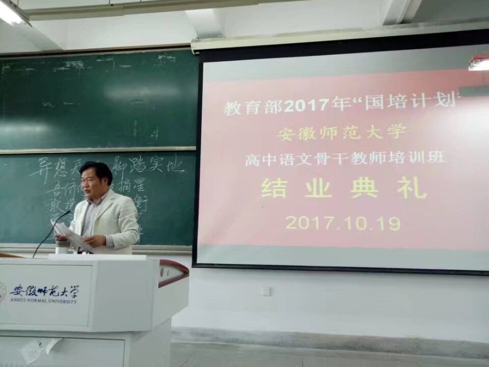 结业典礼由班主任夏家顺老师主持,由来自贵州遵义市第四中学的韦香琼老师、重庆市璧山中学王巧灵老师及广西柳州市第六中学的唐勇老师分别上了10分钟的汇报课程。随后,来自重庆市第十一中学的张俊老师就“大阅读课程”进行了交流,强调学生阅读的广泛性和计划性。随后是几位学员代表发言,都一直认为本次培训班课程安排精当,组织完美,大家收获特别多。来自河南嵩阳高级中学的刘秋珍老师用“点亮生命”来概括这十天在国培班的收获,“看到了人生的目标,寻到了人生的方向,我的生命被点亮了!”河南省实验中学崔矿山老师作为班长发言意味悠长,他用隽永的文字写下了“异想天开,脚踏实地”的感言,并表达“莫言今朝精卫少,且邀他日填海平”的愿望。最后两个小组的全体学员上台集体朗诵,唱响了这支献给安徽师大的歌:“鸠兹炼金,点亮了一双双期盼的眼光;专家讲座,唤醒了一颗颗滋长的希望。十天的日子很短,短到时间长河里涟漪不起;十天很长;长到杏坛的桃李潜滋暗长。”
