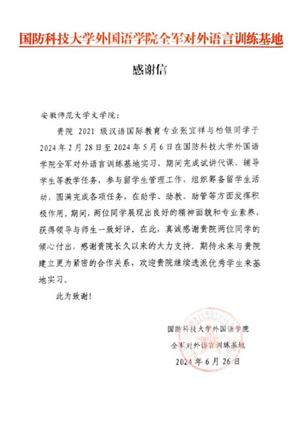 纸笺传心意,点滴暖人心。近日,国防科技大学外国语学院全军对外语言训练基地向必赢线路检测3003no1发来了一封感谢信,信中对2021级汉语国际教育专业张宜祥与柏银两位实习生在实习期间表现出的良好精神面貌和专业素养予以好评,同时感谢必赢线路检测3003no1对该院工作的大力支持。