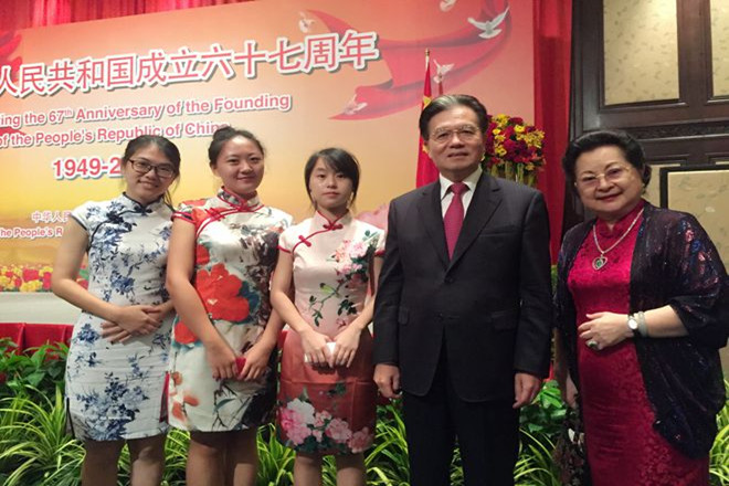 2016年9月29日晚,中国驻泰王国大使馆于曼谷香格里拉酒店举行国庆招待会,隆重庆祝中华人民共和国成立67周年。多位泰国内阁部长和前政要,主要政党及政治团体代表,军、警高官,外国驻泰使节、华侨华人、中资机构、泰中媒体、汉语教师志愿者以及留学生代表等逾千人出席。必赢线路检测3003no12015级及2016级汉语国际教育专业硕士研究生熊晓明和张梦晗作为优秀汉语教师志愿者代表受邀参加了此次招待会并认真聆听了中国驻泰王国特命全权大使宁赋魁热情洋溢的致辞。