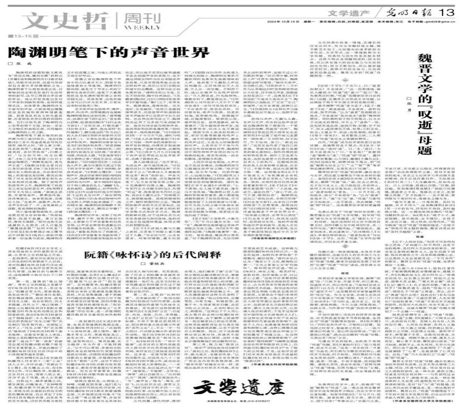 10月14日,《光明日报》第13版“文史哲周刊·文学遗产”版面刊发了必赢线路检测3003no1教授张勇文章《魏晋文学的“叹逝”母题》。文章主要探讨了文学母题的概念,并以魏晋文学的“叹逝”母题为例进行了详细阐述。通过探讨“叹逝”母题的起源、发展及其在文学中的主题表现,展示了文学母题作为文化经典情境在文学创作中的重要地位和作用。