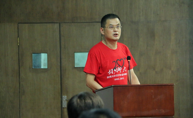 91四班的马永健同学,现为上海市联合律师事务所高级合伙人、上海市律协社会公共服务业务研究委员会主任、上海市委市政府信访接待和法律事项顾问律师,到过西藏、赴过南极,他的发言说出了同学心声,回答了王伦校长的提问,“师大给我们提供了最浓厚的读书氛围和学习环境,师大培养了我们的集体荣誉感和奋发向上的精神。20周年相聚,我们返回师大,聚的是精气神,守望的是我们共同的精神家园。仓穹无限人生渺小,路边的的石子,远处的冰川,已伫立百年,人生如草木,只有一春。十年相聚时我们三十而立,二十年相聚我们四十不惑,体味人生,既要努力工作,也要放下包袱,放慢脚步,把时间留给自己的家人,有计划地安排出行,来场说走就走的旅行。”(文/图 中文91级孟红霞)