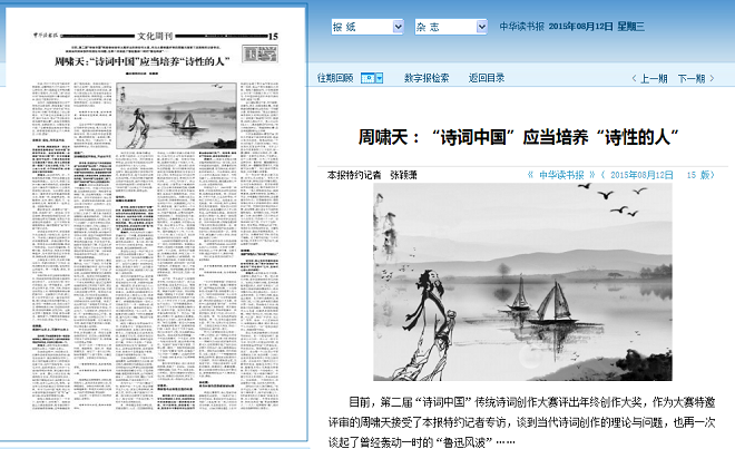 周啸天:我们应该要有这样一个传播的平台。中国历代好的诗篇,往往借助《诗话》一类的著作而得到广传,诗话著作就是一个传播的平台。好诗不但有读头,而且有讲头。诗词家在讲诗的时候,会信手拈来举些例子,这些例子,往往就会流传开来。