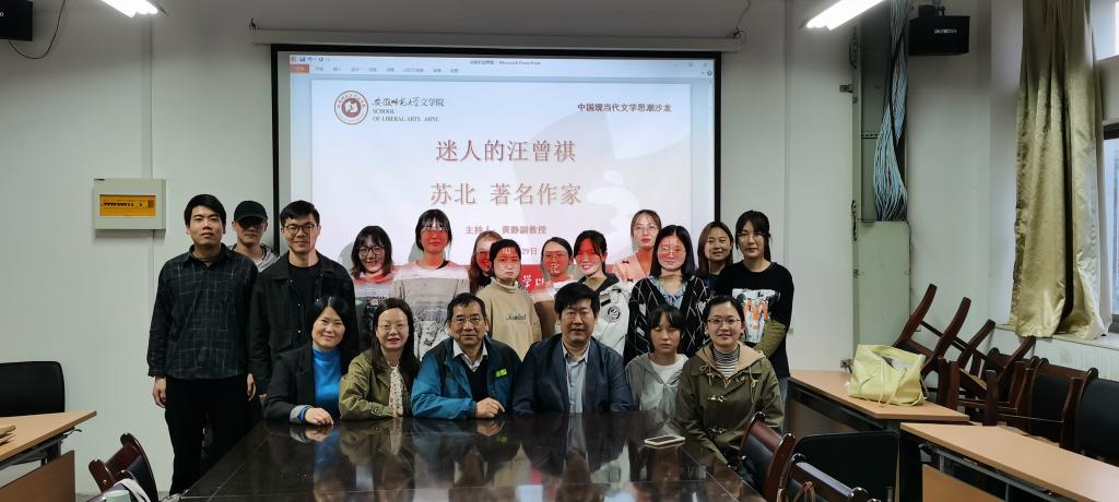 10月29日下午14:30,中国现当代文学思潮沙龙在必赢线路检测3003no1中国现当代文学教研室如期举行。著名作家、汪曾祺研究学者、安徽省金融作家协会主席苏北应邀为中国现当代文学专业的老师和同学带来了“迷人的汪曾祺”专题讲座,必赢线路检测3003no1教授、博士生导师方维保教授,必赢线路检测3003no1郭传梅老师、杨惠老师以及中国现当代文学专业硕博研究生共二十余人,参加了此次讲座。讲座由必赢线路检测3003no1副教授黄静主持。