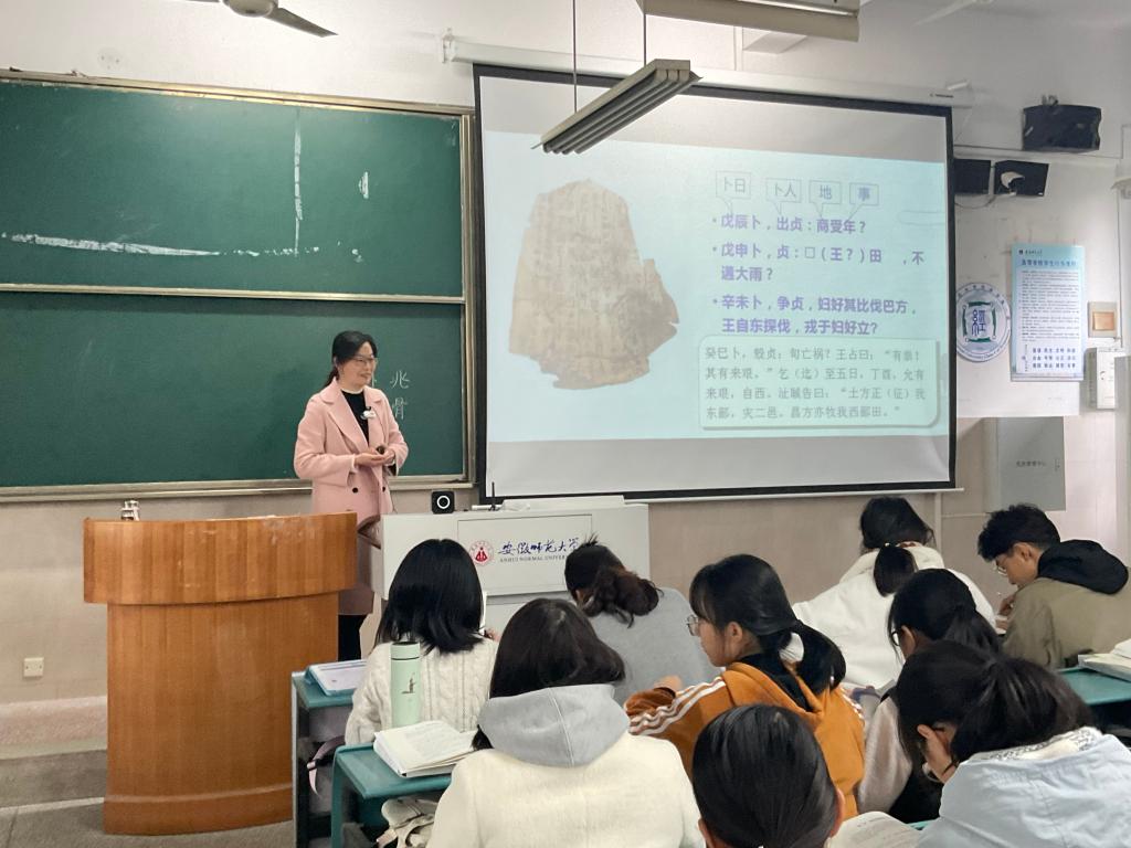 王轶老师此次讲授的内容是“先秦叙事散文”,王老师首先向同学们介绍了我国古代散文发展的两条主要脉络,然后进入本节课讲述的第一部分即甲骨文和铜器铭文的相关知识。针对大一新生专业知识相对薄弱而讲授内容又较为艰深的情况,王轶老师做了精心准备。首先是向大家介绍了甲骨文的发现等较有趣味的相关知识背景,以引起学生的学习兴趣;其次在讲授过程中以问题为导向,经常以提问的方式激发学生思考,所设置的问题既做到了由浅入深,又能够与讲授知识紧密结合;此外,辅以制作精美生动活泼的PPT课件,教学多媒体的动画展示与王老师的讲授过程、同学们从思考到获得答案的过程完美同步。在本课的第二部分关于《尚书》《春秋》的介绍过程中,王轶老师的讲授做到了既基于教材而又高于教材,既有对学生熟练掌握教材内容的指导,又给学生补充了与教授内容相关的大量古代文学史、文化史的相关知识。