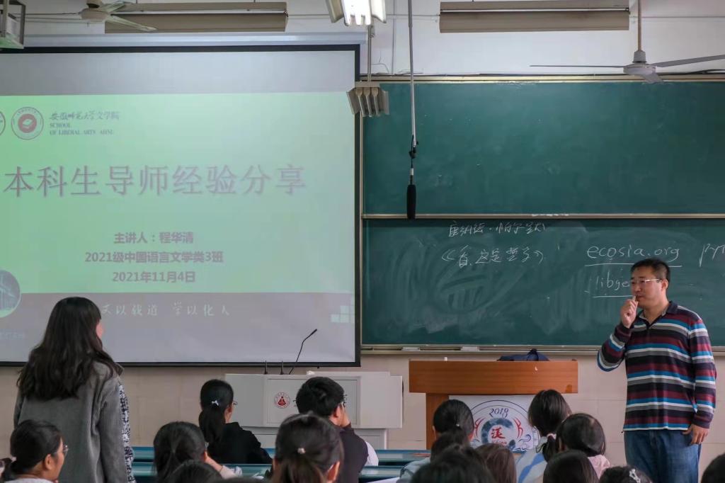 11月5日上午,程华清老师为2021级中国语言文学类3班作经验分享交流,他结合自身学习经历和教学经验,从英语学习方法、到推荐书目与搜索引擎、再到时间与精力分配的取舍,为大家答疑解惑。