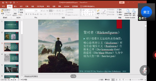 新进教师黄江博士在“美学与艺术学基本问题”分会场作了“艺术哲学中的时间性反讽”的学术报告,从德国浪漫主义美学的角度,结合古典哲学与现代艺术,系统分析了艺术哲学这一交互性领域当中的反讽问题,及其相应的时间性要素。二位教师的参会发言得到了与会学者们的一致好评,增进了国内美学学术的交流与互动。