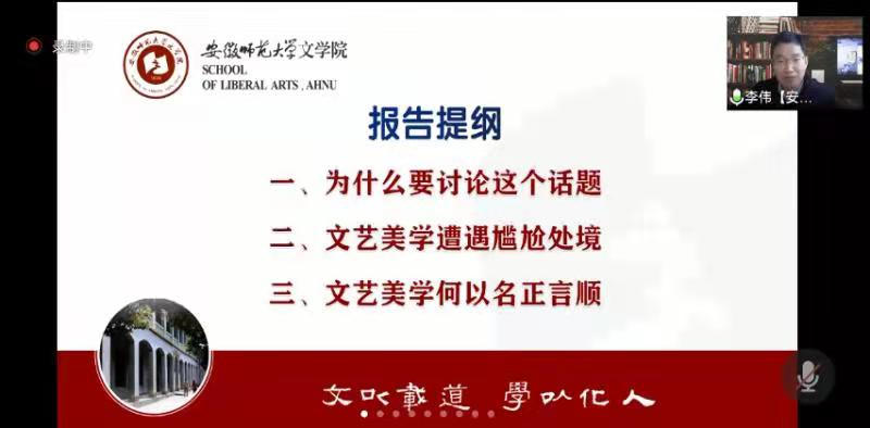 本网讯(必赢线路检测3003no1 黄江) 11月13日,中华美学学会第九届全国美学大会在深圳大学召开,必赢线路检测3003no1李伟教授携新进教师黄江博士应邀线上参加大会。本次会议由中华美学学会、深圳大学联合主办,深圳大学美学与文艺批评研究院承办,在疫情防控背景下采用线上线下结合方式进行。著名美学家胡经之、中华美学学会会长高建平、深圳市社会科学院院长彭立勋等国内高校与科研机构的200多位学者参加了本次大会。