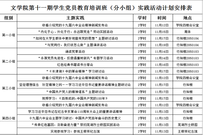 培训班以建党百年和十九届六中全会胜利召开为契机,组织各小组开展系列主题实践活动,使学员在躬身实践中真正做到受教育、长才干。第一小组开展“内化于心,外化于行,永远跟党走”劳动实践活动,从小事和点滴做起,践行党的宗旨。第二小组的学员前往社区义务支教,为孩子们带来一节生动的党史课。第三小组聚焦时代热点,开展“中国共产党人的精神谱系”主题研讨会,学员们积极分享心目中的榜样人物。第四小组组织学员祭扫戴安澜将军墓,缅怀革命先烈,树立家国情怀。第五小组开展红色书籍分享会,铭记先辈创业艰辛,珍惜如今生活来之不易。第六小组开展了“手绘风筝献给党”主题实践活动,手绘风筝献礼百年,讴歌新时代新气象新作为。第七小组组织观看建党献礼剧《功勋》,开展主题学习研讨会,寓教于乐,提升凝聚力和向心力。第八小组开展先进党员事迹视频观摩学习会,引导学员学习先进事迹,加强党性修养。