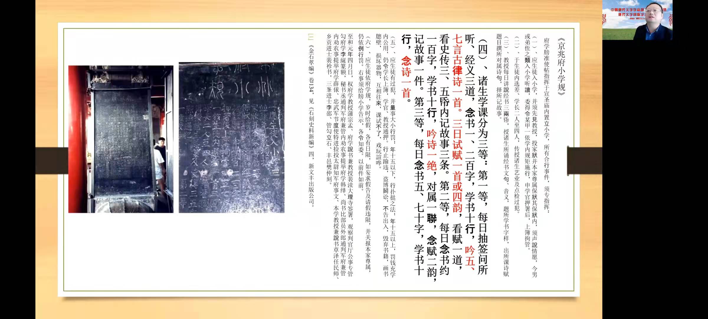查先生由一本唐末传承下来的唐律绝选本《京兆府小学规》引入话题,从唐末“时文”教材的流行与抄印转换走势的遇合、唐末诗家对印本的利用与晚唐体的流行、宋初对唐末五代刊本的接受与晚唐体诗学的影响等三个方面娓娓道来,展开具体讲座。他认为,唐末五代至宋初是抄印转换的初期,也是白体、晚唐体风行的时期,两事密切相关。由于唐人以当代诗集为教材、中唐文人主动追求传播流量,印刷术带来书籍业进一步繁荣,促进了教材化诗集的流行。讲座深入浅出,课件图文并茂,制作精美,引用大量碑刻、图卷、敦煌抄卷及古籍刊本书影等。近两个小时的报告,查先生一气呵成,听者意犹未尽。