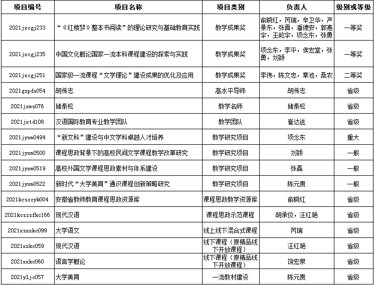 根据近期发布的《安徽省教育厅关于公布2021年高等学校省级质量工程项目名单的通知》,我院共有17个项目获得评审通过,其中,教学成果奖一等奖2项,二等奖1项,教学团队1个,课程思政教学资源库1个,教学研究项目4项,继续教育教学改革项目1项,课程思政示范课程1门,一流课程3门,一流教材建设1项,高水平导师1名,教学名师1名。