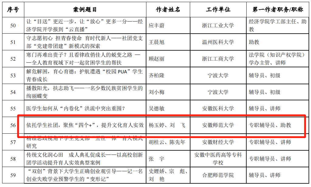 近日,由教育部思想政治工作司指导,《高校辅导员》编辑部举办的2021年度全国高校思想政治工作优秀案例征集活动结果公布,我院杨玉婷、刘飞撰写的《依托学生社团,聚焦“四个+”,提升文化育人实效》荣获全国三等奖。