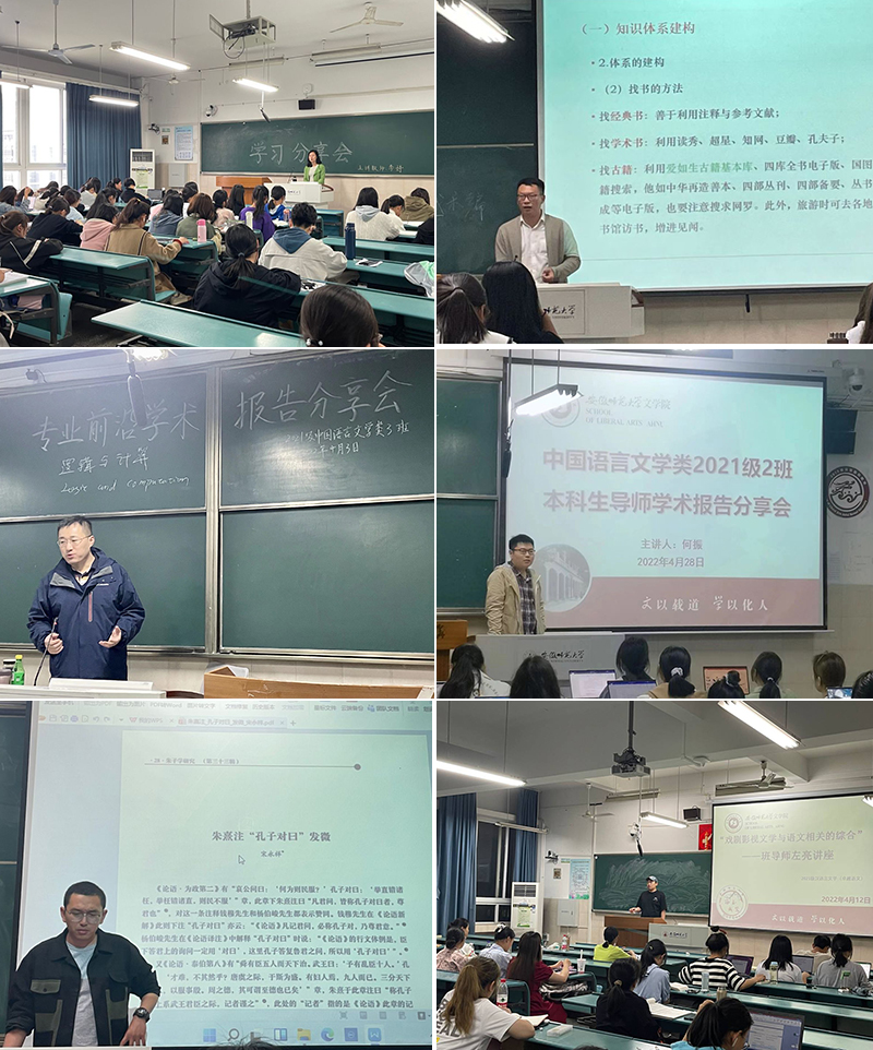 班导师张爱云为汉语言文学(师范)专业1班全体同学带来了《语言学学科门类及学习方法》专题辅导报告,进一步提升了同学们对语言学的认知水平;班导师李婷结合自身学习经历,指导同学们做好学业规划,帮助大家明确学习任务和目标;班导师宋永祥应邀为2021级汉语言文学(师范)3班作了题为《朱熹注“孔子对曰”发微》的专题讲座,启示同学们阅读古籍应保持清醒的头脑,要多加思考其正确性;班导师左亮为2021级卓越语文教师实验班学生带来了《戏剧影视文学与语文相关的综合》专题报告,向同学们详细介绍了戏剧影视文学的起源,以及其发展历程和对当今生活的影响;班导师何振为2021级中国语言文学类1班全体同学进行古代文学论文写作指导,他提醒同学们要在学习中追寻文学的意义、文学存在的价值等,在论文写作上要有辩证思维,注重文本精读;班导师王祯从古典文献学定义、分类、范围,以及知识体系建构和论文撰写等方面,为同学们做了详细介绍;班导师程华清为2021级中国语言文学类3班带来了题为《逻辑与计算》的专业前沿学术报告,帮助学生开拓了理论视野,并要求同学们在文学的学习中要注重运用理性思维方法。
