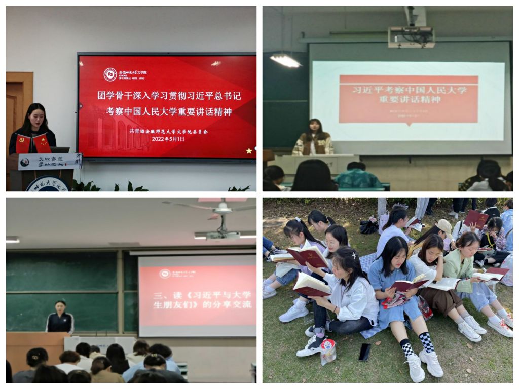 团干领学、集体研学、个人自学,多措并举深化理论学习。5月1日,学院召开“青听青语”团干座谈会,学院党委副书记刘飞、团委书记杨玉婷带领团学骨干们集体学习了习近平总书记考察中国人民大学重要讲话精神,解读了《新时代的中国青年》白皮书和《新时代加强和改进共青团思想政治引领工作实施纲要》。会后,全院各团支部组织广大团员青年认真阅读《习近平与大学生朋友们》《中国青年运动的一百年》《新时代的中国青年》白皮书等学习材料,通过研学和自学,让同学们感悟良多。20级卓语班于津南草坪开展读书分享会,李琳同学分享了自己的心得体会:“在这本书中我印象最深刻的就是习近平同志关心关爱大学生的故事。在总书记这样深切的关怀下,青年大学生也应该牢记教导,努力做有志气、有才气、有锐气、有骨气的新时代中国青年。”20级汉语国际教育研究生路畅表示,“站在‘两个一百年’奋斗目标的历史交汇点上,面对百年未有之大变局,我深切感受到了习近平总书记对青年关注关心关爱的温暖记忆,我要向总书记学习,做中国文化的坚守者、中国故事的传播者、中国精神的弘扬者、中国力量的贡献者!”