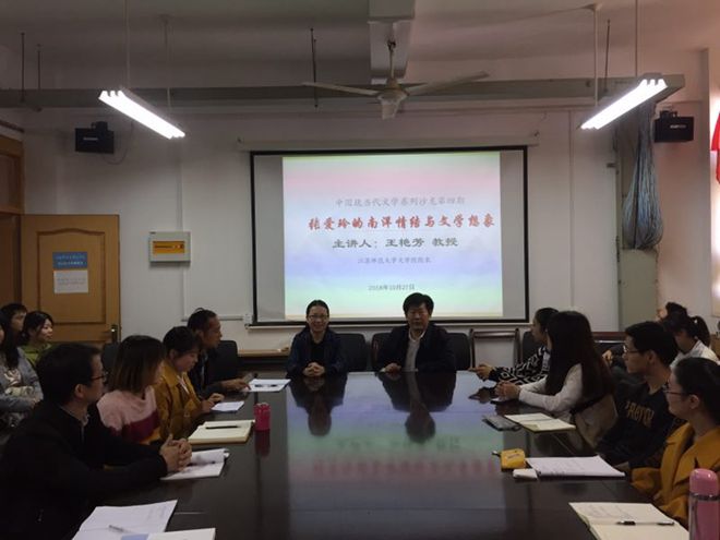 讲座伊始,方维保教授向大家热烈介绍了王艳芳教授近年来的学术研究领域,及其刚从新加坡游学归来的经历。王艳芳教授分了四大部分来讲述张爱玲的南洋情结与想象。王教授先是和大家讲述了张爱玲五次与南洋失之交臂的经历,表明张爱玲对南洋所特有情结的缘由。随后,王教授和大家一起具体探讨了张爱玲作品中所出现的南洋历史、宗教、人物、风景、服饰、饮食、语言等南洋元素。继而,王教授研讨了张爱玲南洋书写的观照角度与异域审美。最后,王教授总结了“被凝视”的张爱玲对于南洋的书写所提供的南洋书写镜像。她认为:张爱玲笔下的南洋是作为文化想象共同体的南洋。