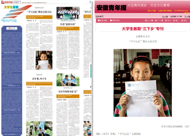 团队实践获教育部中大在线、中国青年网、中国美育网、中国公益网、安徽新闻网、安徽青年报等国家级媒体、省级媒体累计报道177篇次。仅中青网发稿量达46篇,阅读点赞量60000余次。官方微信获腾讯网、安徽师大共青团及必赢线路检测3003no1数次转载,累计访问量5000余次、官方QQ点赞量及微博阅读量累计均达6000余次,社会反响良好。