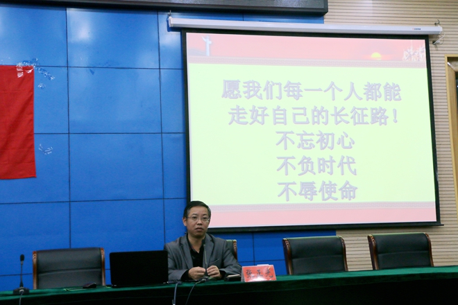 随后,张教授从为什么聚集在党旗下、党员面临的考验以及争做合格党员三个方面具体展开阐述。他提出,党是中国人民的旗帜、先锋队、明灯,在实现中华民族伟大复兴中发挥重要作用,并以诸多优秀党员的先进事例以助阐述,引导在场同学明确党员担当。同时,他指出,党员干部也面临四大危险和四大考验,并以四风不正、信仰缺失的现实事例警醒在座同学。张正光教授强调,端正动机,纯洁入党;坚定信仰,不忘初心;砥砺品格,完善自我;心怀天下,超越小我;学习理论,武装自我,是成为一位合格党员的要求。最后,他祝愿全体同学走好自己的长征路,不忘初心,不负时代,不辱使命!