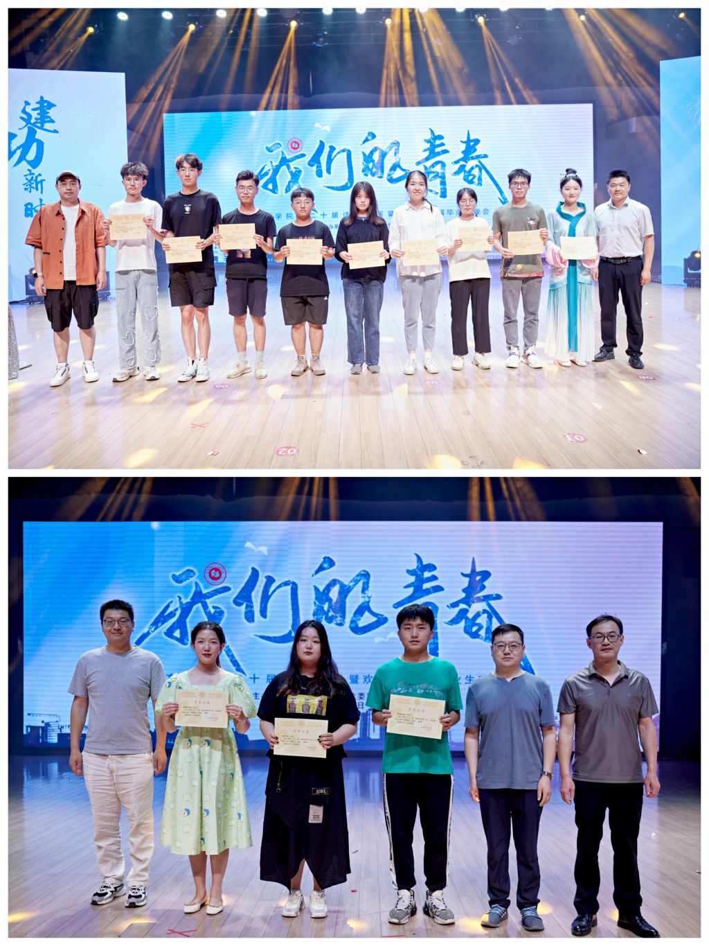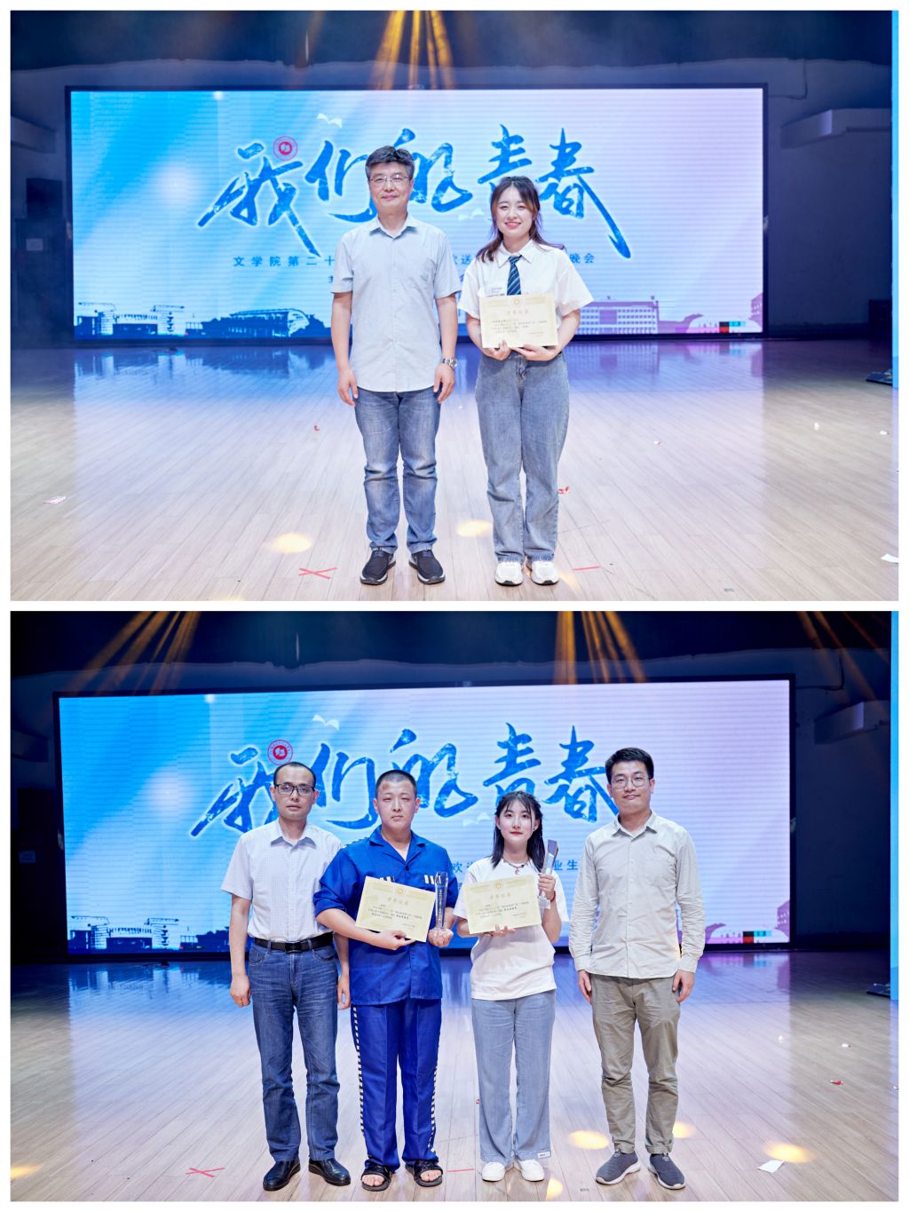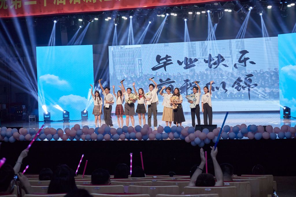 时光易逝,且须珍惜。剧目《时间都去哪儿了》把网络时代流行的“微信、微博、抖音”这三大手机APP具象成人,通过幽默诙谐的语言,警示青年学子珍惜时间,把握当下,不负青春韶华;歌曲《干杯》以毕业生代表们悠扬的歌声将同学们四年的校园生活娓娓道来;剧目《鸡兔同笼》,作为第七届乌镇戏剧节青年竞演单元的“最佳戏剧奖”,以一道难为过众多小学生的基础数学题、一个个看似平淡的问答方式,展现了亲子之间最难以言说的、深切的爱;古典舞《采薇》化诗学经典为轻盈飘逸的水袖舞姿,让观众领略到传统文化的独特魅力;心理剧《蓝气球》走进抑郁患者的内心,讲述主人公战胜心魔重获新生的故事,如春风化雨般传授观众基本的心理学知识,引发大家对心理健康的重视;以青春之我,谱盛世之华章。剧目《青春之我》依托一节生动的思政课,与李大钊先生跨时代的对话,展现当代青年以“青春之我”建设“青春中国”的坚定信念。凤凰花的花语是别离,相思,热血青春,晚会最后毕业生代表在观众席耀眼的追光下与所有老师同学们动人合唱《凤凰花开的路口》。