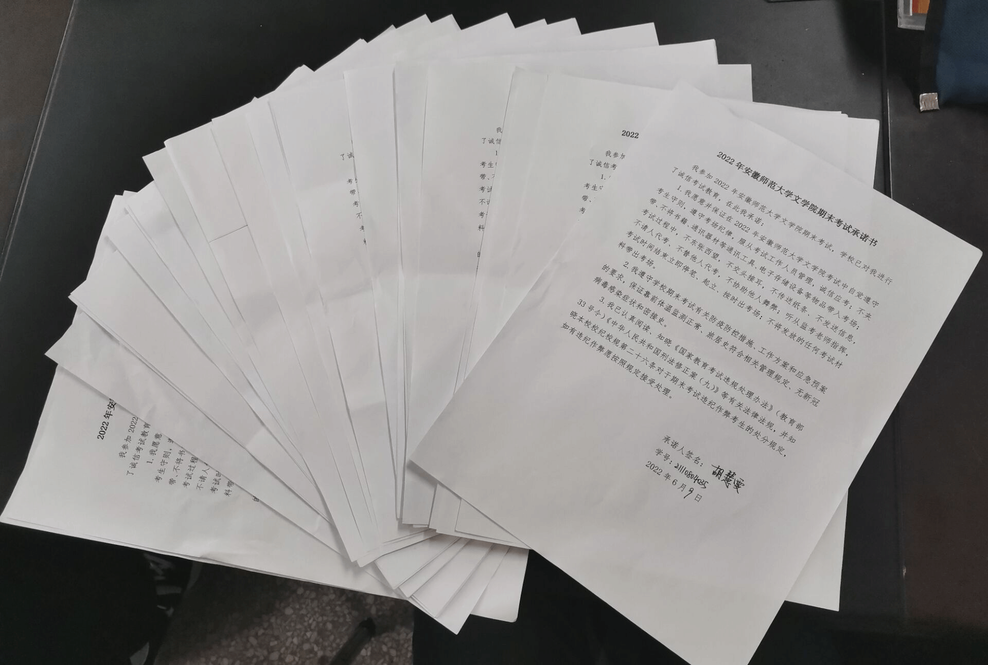 各班级在传达校院两级有关诚信考试文件精神的基础上,自创性地开展相应主题教育。诚信宣誓,铿锵誓言声传达以诚立身;庄严承诺,一笔一划间书写守规守纪。相应主题教育的开展,进一步增强了学生诚信考试的意识。
