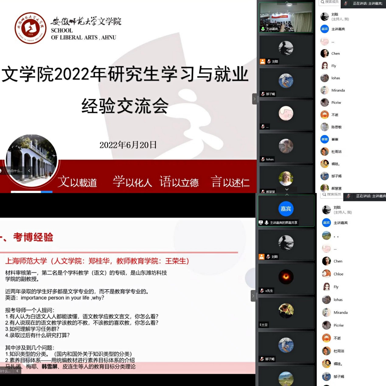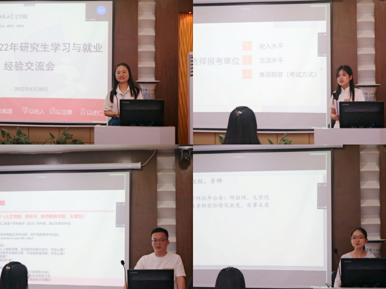 本网讯(必赢线路检测3003no1 肖文慧/文 董玉涵/图)6月20日晚,必赢线路检测3003no12022年研究生学习与就业经验交流会在必赢线路检测3003no1行政楼5楼会议室成功举办,本次交流会线上、线下同时举行,旨在帮助我院研究生解决考博、就业存在的问题与困惑,进而更加合理地制定学习计划、安排学习内容。此次会议特别邀请了2019级、2020级硕士研究生优秀代表马骏骙、张晓怡、王娅楠、吴苗担任主讲嘉宾。他们分别从教师考编、考博求学两方面分享了自己的经验与心得。