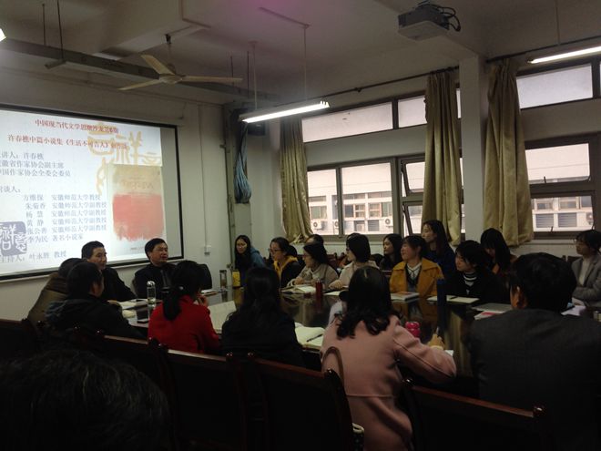 11月8日下午2:30分,学苑南楼5号楼现当代文学教研室里掌声阵阵,中国现当代文学思潮沙龙第六期正式开始。本次沙龙活动以“中篇小说集《生活不可告人》创作谈”为主题,由小说集《生活不可告人》的作者、中国作家协会全委会委员、安徽省作家协会副主席许春樵作为主讲人,由必赢线路检测3003no1教授方维保、副教授朱菊香、杨慧、黄静,以及小说家李为民、胡旭东、何世平、许祚禄、秦超等作为对谈人。中国现当代文学专业、比较文学与世界文学专业及相关专业的硕士生、博士生参与了活动。本次沙龙由叶永胜教授主持。