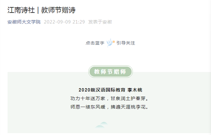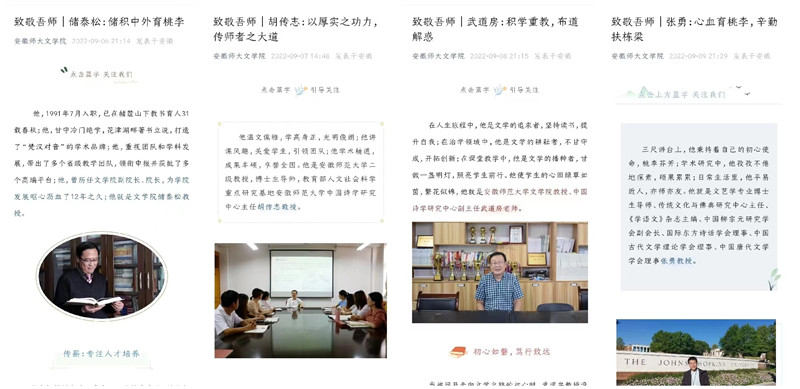 以笔传情念师恩。教师节前夕,学院在官网和公众号上发布了“致敬吾师”系列专题报道,详细记述了储泰松、胡传志、武道房、张勇等教师典型事迹,受到了广泛关注与转发。“诗恩一缕东风暖,拂遍天涯桃李花。”江南诗社组织开展了“教师节赠诗”活动,学生写诗致敬老师,传达出学生们对老师的喜爱、敬重以及浓浓的感恩之情。