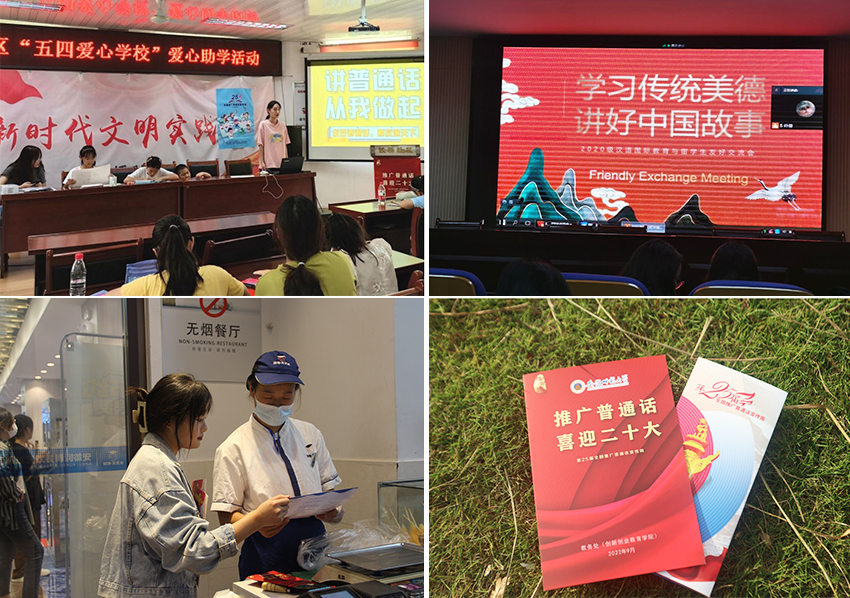 学社联动,拓展宣传教育载体。必赢线路检测3003no1组织各专业、社团成立普通话宣传推广小组,结合学院特色,探寻创新普通话普及与推广形式。9月17日,五四爱心学校一行12名志愿者前往芜湖市弋江区铁桥社区开展“推广普通话,喜迎二十大”特色课堂活动。通过带领孩子们观看普通话推广视频、说绕口令、参与知识竞赛红色诗词诵读等,让孩子们在朗诵中感受语言魅力,赓续红色基因,汲取奋进力量。来自2020级汉语言文学(非师范)专业的普通话宣传推广小组成员在花津校区一、二食堂前,将事先制作好的宣传册发放给就餐学生和食堂工作人员。2020级汉语国际教育专业以此次推普周为契机,与国际教育学院联合举办留学生“学习传统美德,讲好中国故事”普通话推广活动,通过线上交流,进行普通话正音、演讲等,帮助留学生改善汉语口语,了解中国文化,提升汉教专业学生口语表达能力和职业技能水平。