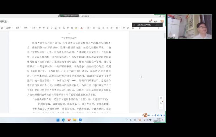 9月23日晚上7:30,“古典文献学学术沙龙”第十四期通过腾讯会议在线上如期举行。厦门大学中文系教授、博士生导师、台湾大学客座研究员、中国唐代文学学会常务理事吴在庆先生应邀为师生带来“被误读的杜甫诗句”专题讲座,来自省内外多所高校的教师、硕博士生、本科生共100余人齐聚线上,参与交流讨论。本次讲座由韩震军教授主持。