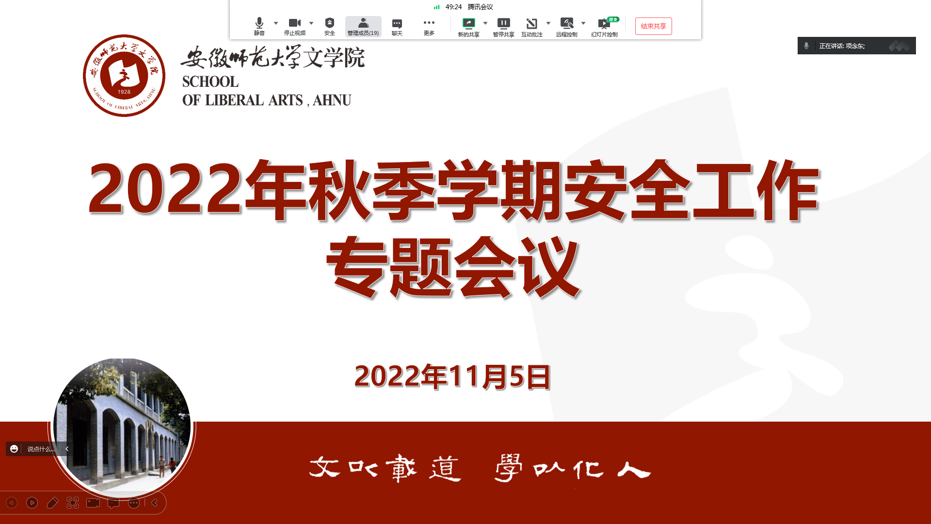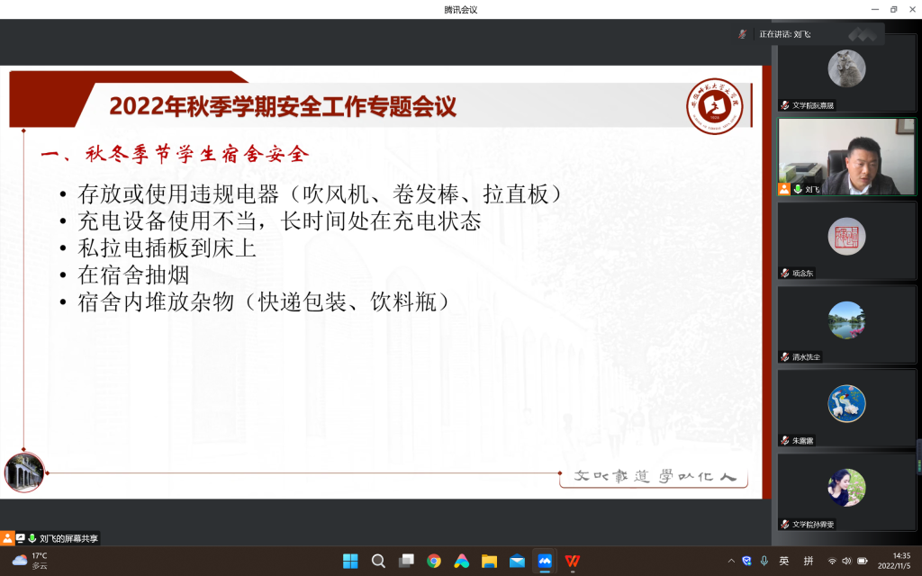 11月5日下午,必赢线路检测3003no1召开2022年秋季学期安全工作专题会议。院长项念东,副院长李伟,全体本科生、研究生专兼职辅导员参加线上会议,会议由院党委副书记刘飞主持。