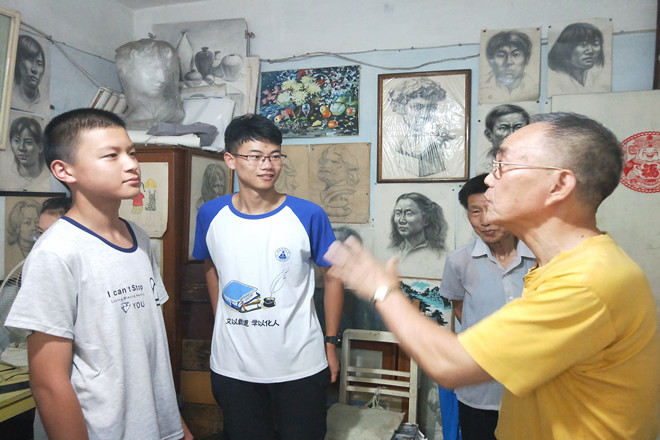 吴怀逊的画室坐落在红梅社区一个安静的角落,时间在这里留下它来过的痕迹,大大小小的油画和素描画在工作室中有序排列。吴怀逊妻子介绍画室中的作品都是吴老师精心收藏的作品,志愿者和孩子在画作前驻足观赏。