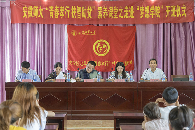 创文促美还乡诺,长践助贫育孝心。7月20号,安徽师大“青春孝行,扶智助贫”素养课堂开班仪式在三合镇中心学校正式开展。仪式由三合镇人大副主席蒋雪梅主持,三合镇党委副书记、镇长王峰,团颍州区委副书记朱囡囡,三合镇中心校副校长张乾坤,部分家长代表,支教班全体学生以及实践团队全体成员到场参加。