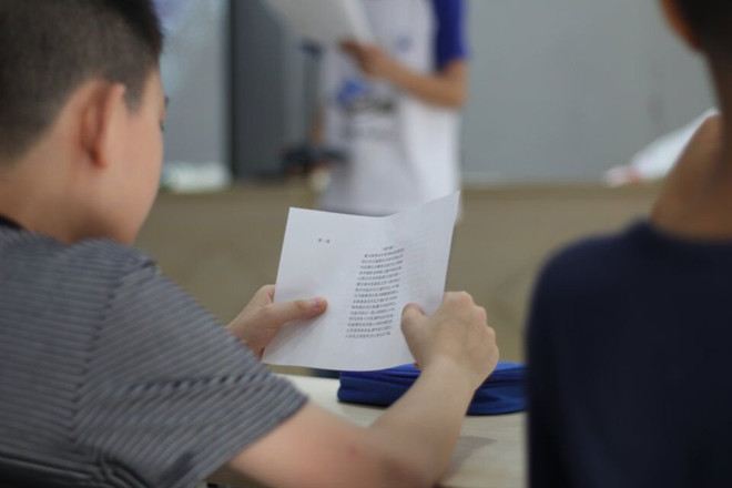 今天的开学第一课是团队成员李守夫的历史文化课课程,在课堂开始前李守夫先带领孩子们朗读了一遍《三字经―朝代歌》,平常坐都坐不住的孩子们此时却都规规矩矩的跟着志愿者整齐大声的朗诵。